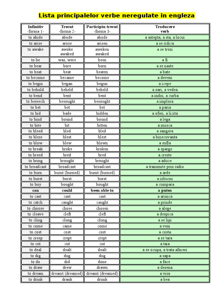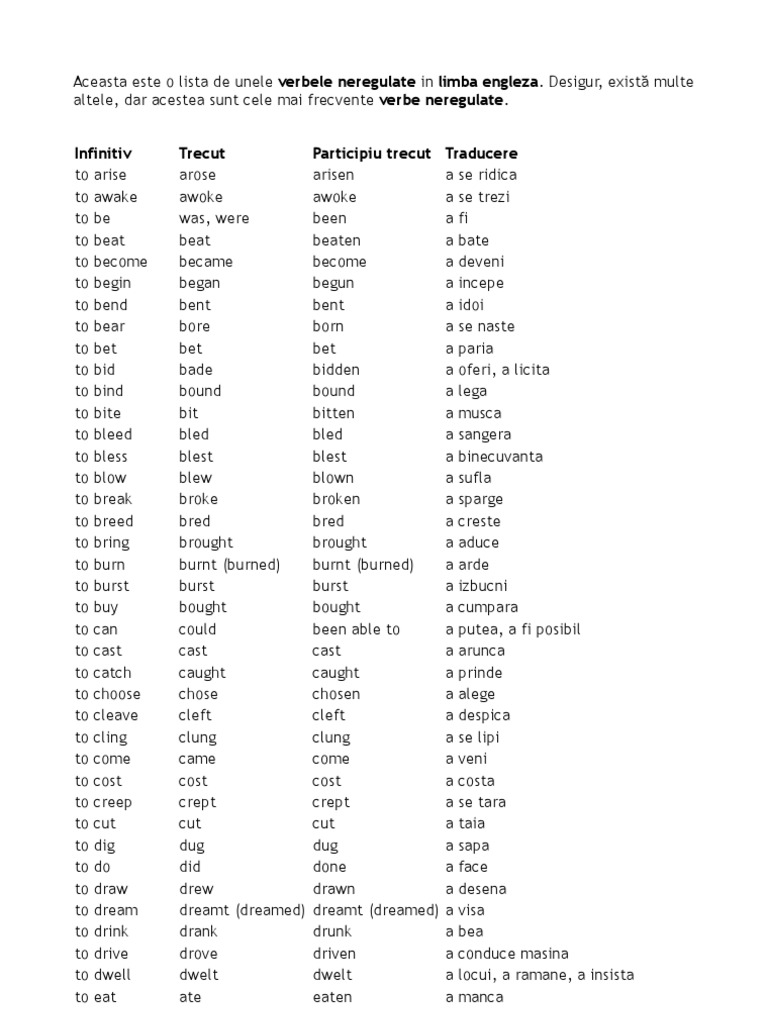 Lista Principalelor Verbe Neregulate In Engleza Infinitiv Trecut Participiu Trecut Traducere Verb