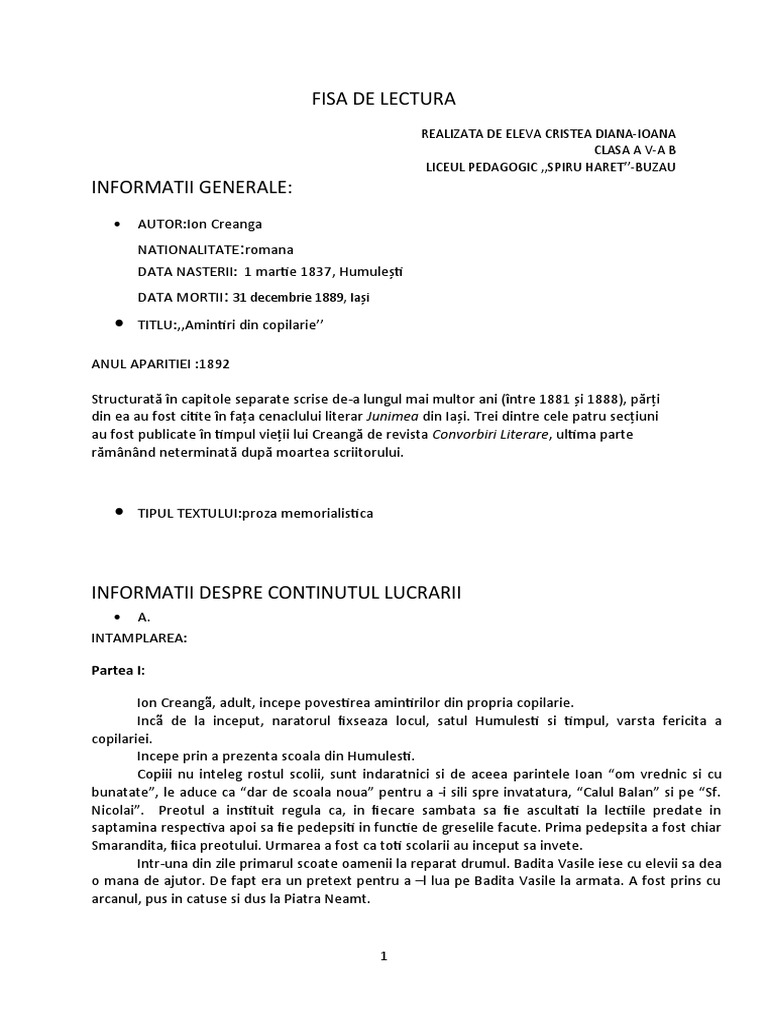 Fisa De Lectura Diana Amintiri Din Copilarie Ion Creanga