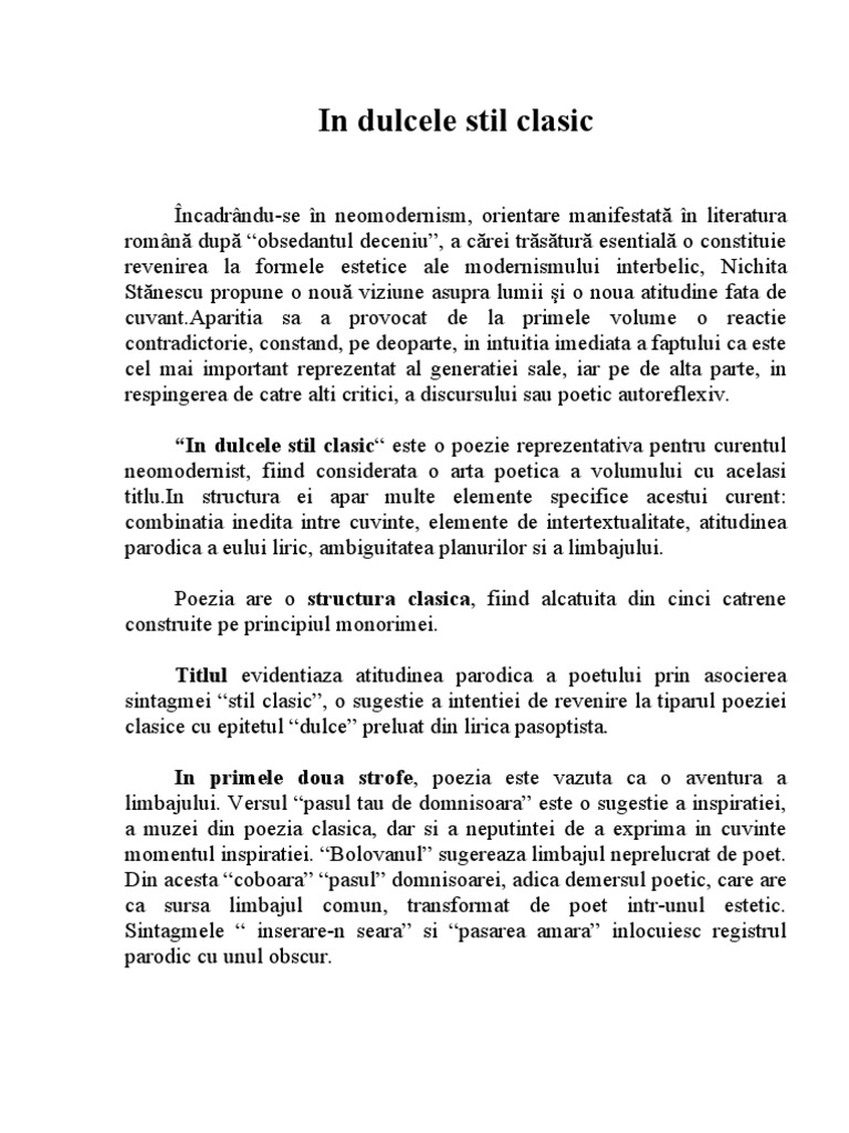 Comentariu Nichita Stănescu In Dulcele Stil Clasic