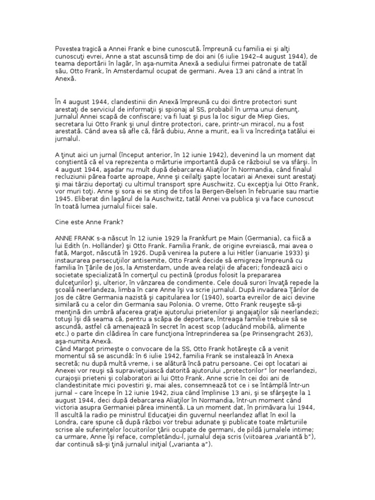 Jurnalul annei frank este una dintre cele mai importante cărți ale secolului xx iar autoareaa devenit una dintre personalitățile despre care este aproape imposibil să nu fi auzit măcar la orele de istorie chiar dacă nu ești un cititor pasionat de literatura tip jurnal. Comentariu literar lung de 6 pagini word la romanul jurnalul annei frank scris de de către o adolescentă în vârstă de 13 ani inițial în forma unui jurnal pentru ca ulterior după moartea sa tatăl ei să publice scrierile ei zilnice și astfel să îndeplinească o dorință care la începutul scrierii jurnalului nu a existat dar pe parcurs de multe ori a revenit ideea dorinței. Din 1947 când s a publicat pentru prima oară în ţările de jos jurnalul annei frank a fost tradus în peste 65 de limbi. Anne frank a tinut un jurnal in perioada 12 iunie 1942 1 august 1944 mare parte fiind in peiroada in care impreuna cu familia se ascundeau.