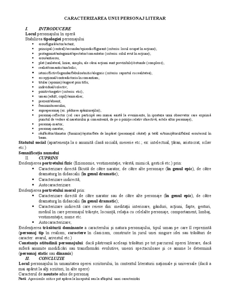 Planul Caracterizarii Unui Personaj Literar