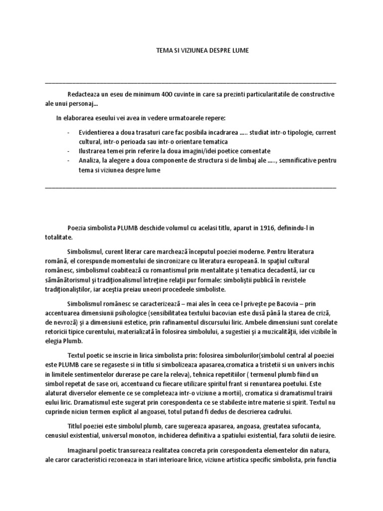 Tema Si Viziunea Despre Lume In Plumb