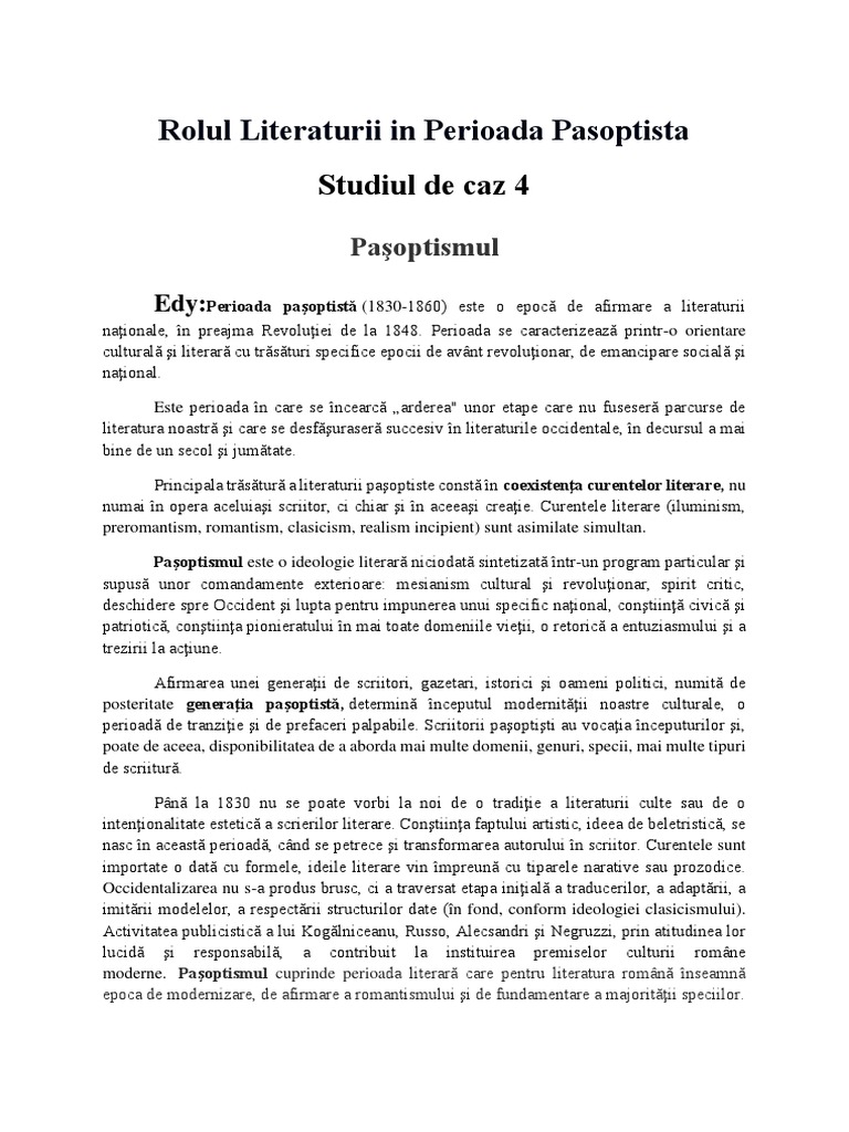 Studiu De Caz Rolul Literaturii In Perioada Pasoptista